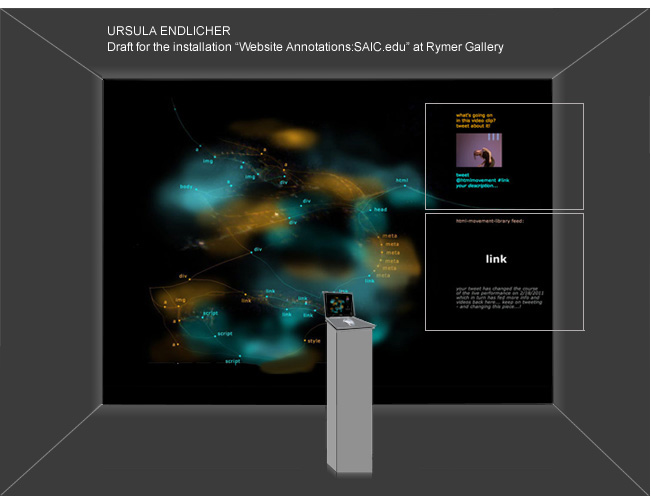 The sound was a mix of different sources, a score composed by the live source code of SAIC.edu. Each HTML tag from the site was musically interpreted. Tags such as HEAD or TABLE were translated into music by